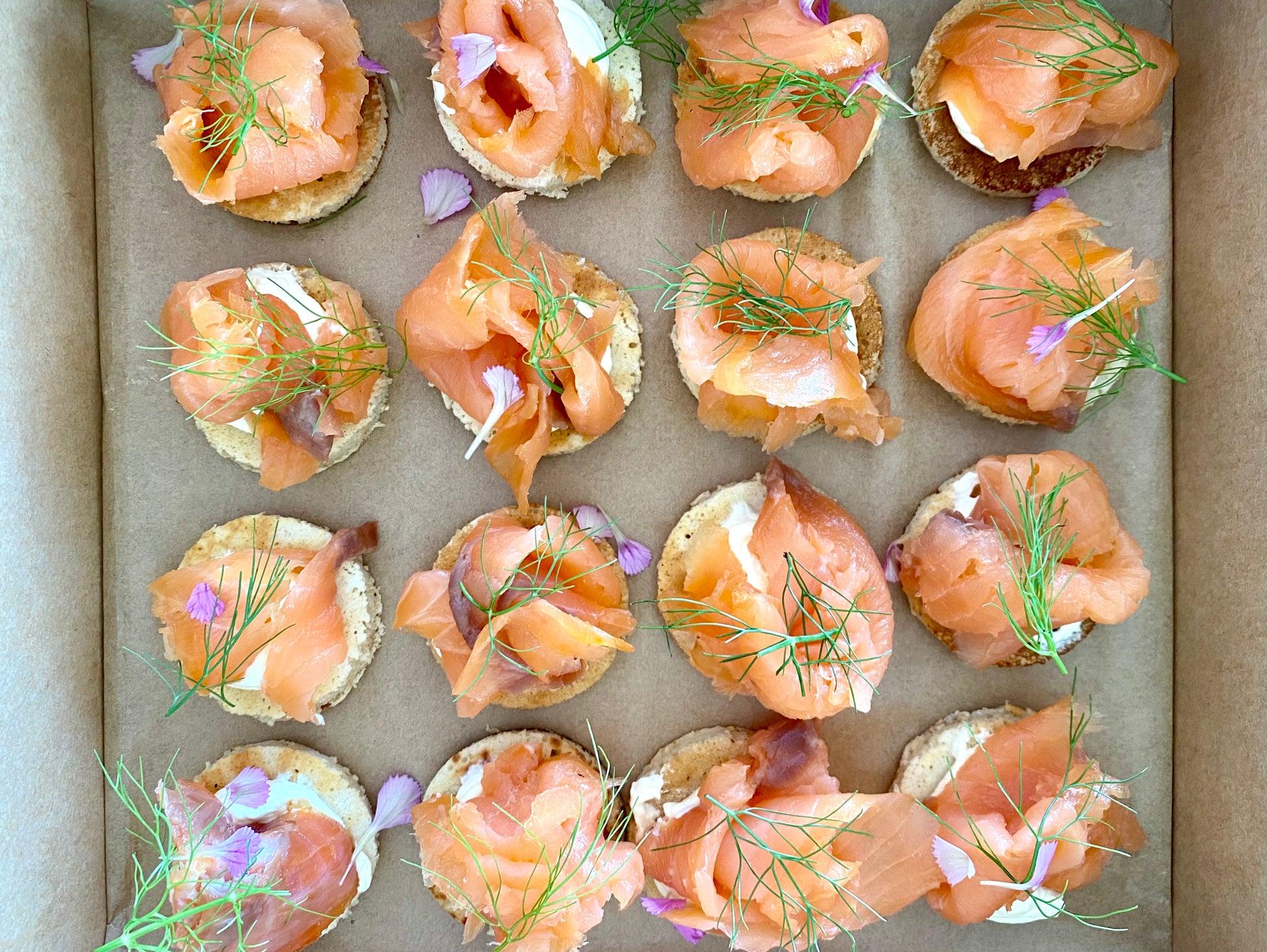 - Blinis x smoked salmon & dill crème fraiche.