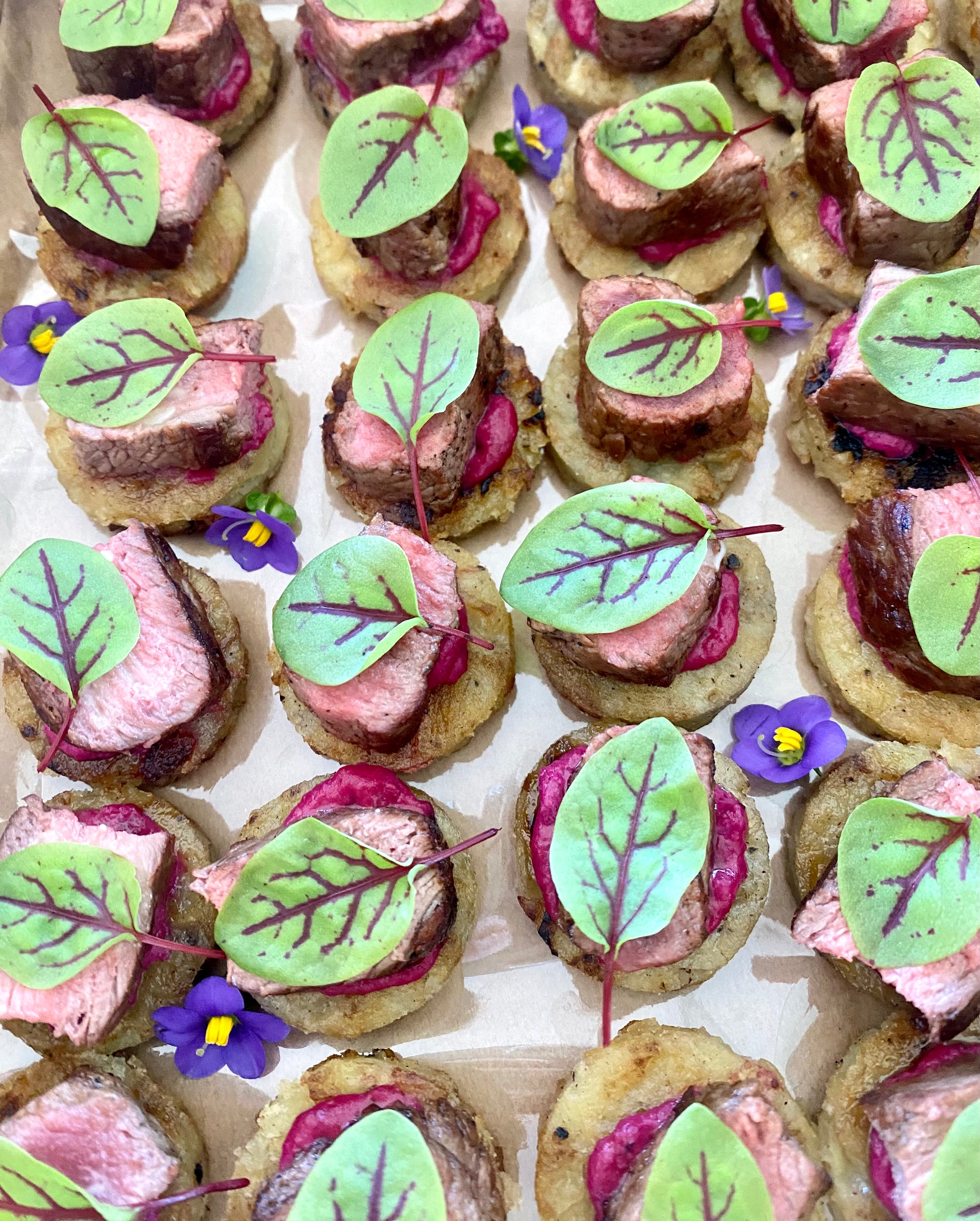 - Wagyu beef potato rosti & beetroot garnished with herbs thyme.